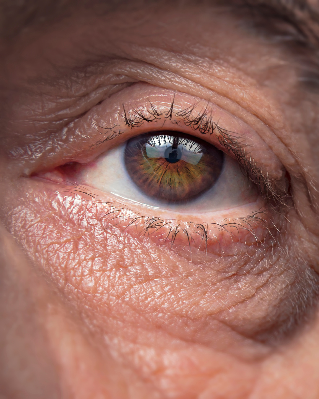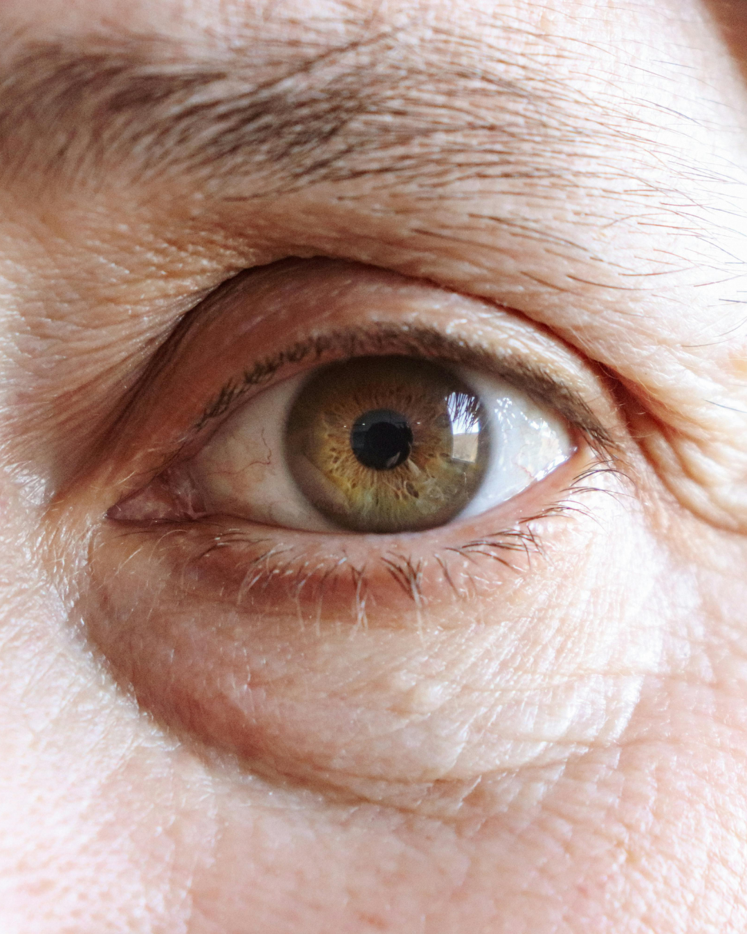 Skóra wokół oczu traci napięcie, przez co oko wygląda na „ciężkie”.